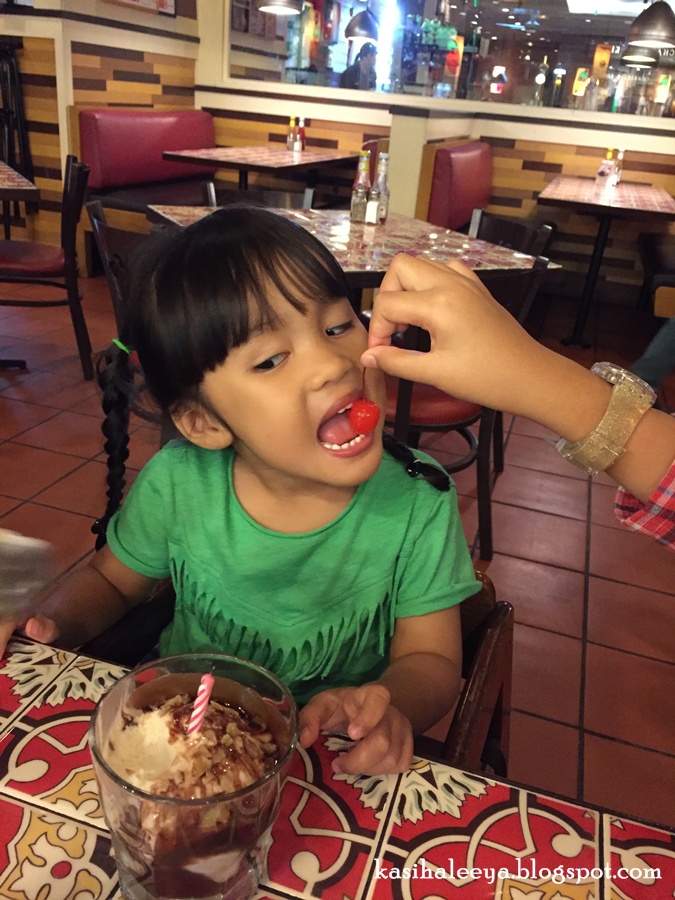 Pastu panggil waiter tu tanya dia boleh tak nyanyi untuk Aleesya? diorang cakap boleh siap bagi complimentary ice cream cake ke apa tah dalam glass tu.. teruja Aleesya bila semua datang ramai-ramai nyanyi sebut nama dia..